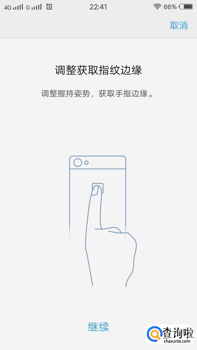 按照提示操作,将手指放在手机背面指纹识别器上,采取指纹,调整获取指纹边缘。