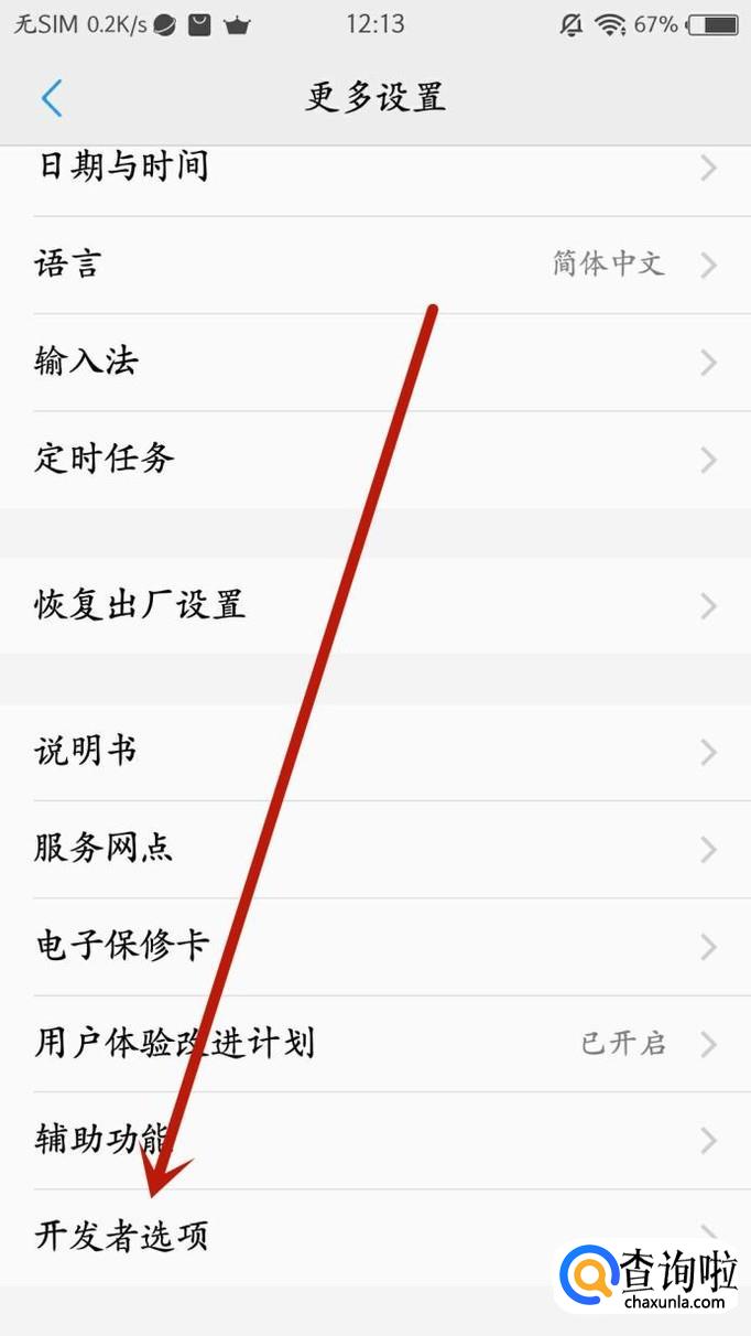回到“更多设置”页面,滑到页面最底端即可看到“开发者选项”,点击该选项进入下一页面,如图所示。