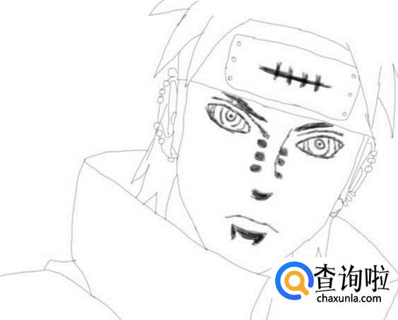 再在面部上画出佩恩的眉毛,并在眉毛下面画出佩恩的眼睛,然后再画出佩恩的鼻子和嘴巴,如图所示: