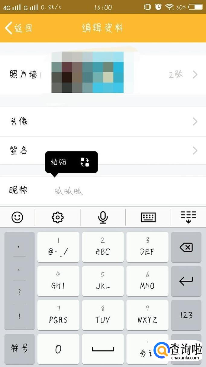 然后复制【 】这个括号里面的内容,在昵称那一栏里删掉原来的昵称,粘贴刚刚复制的内容