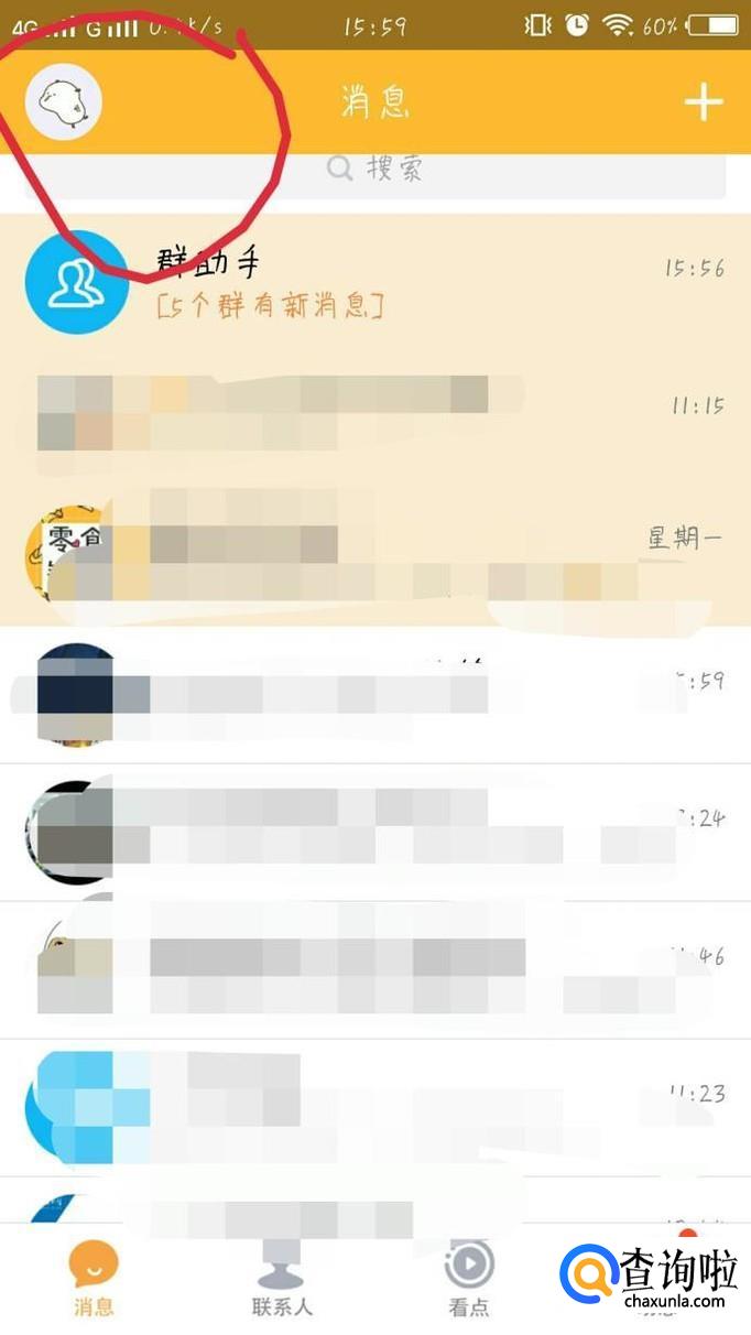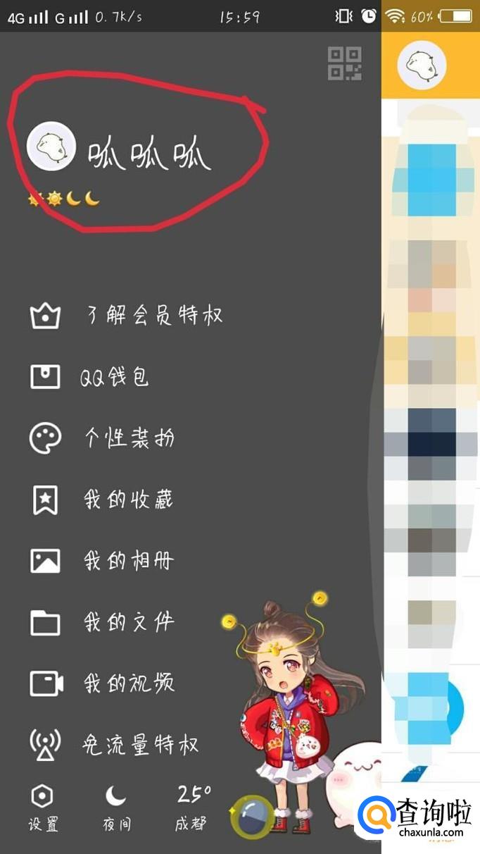 首先打开qq软件,在主界面点击左上角的头像也可以向右划屏幕