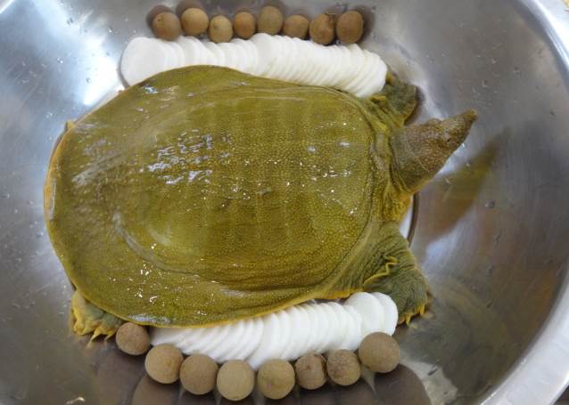 1. 将甲鱼放入热水中宰杀,剖开,去肠、脏并洗净;