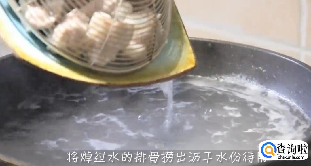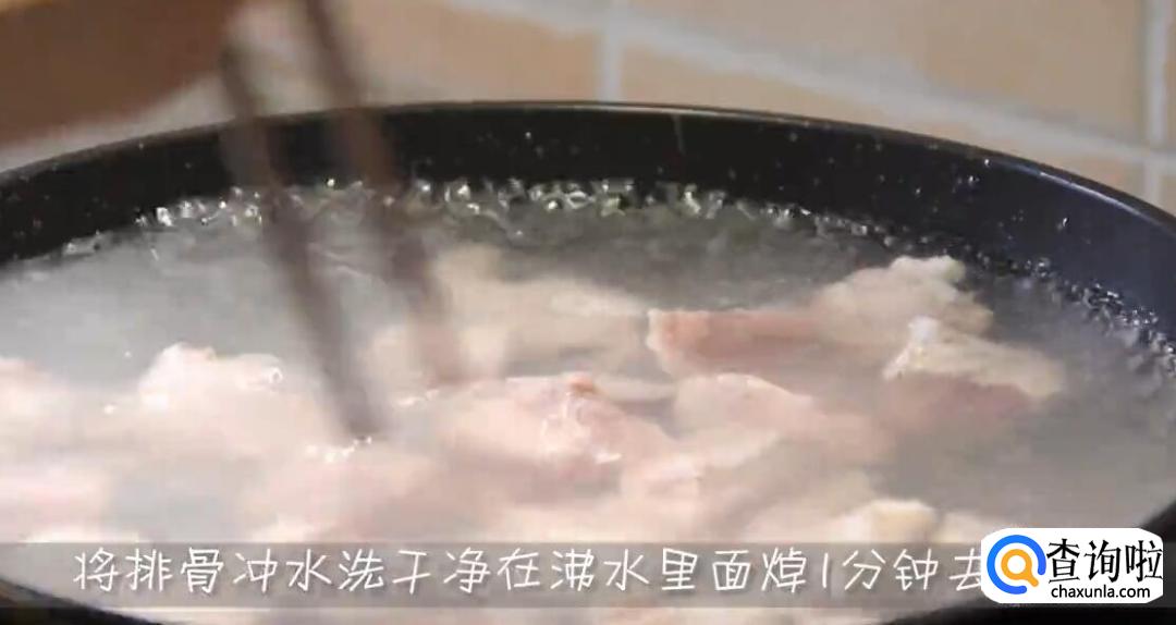 将排骨冲水洗干净,在沸水里面焯水1分钟去掉血水。