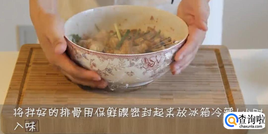 将拌好的排骨用保鲜膜密封起来,放冰箱冷藏一小时入味。