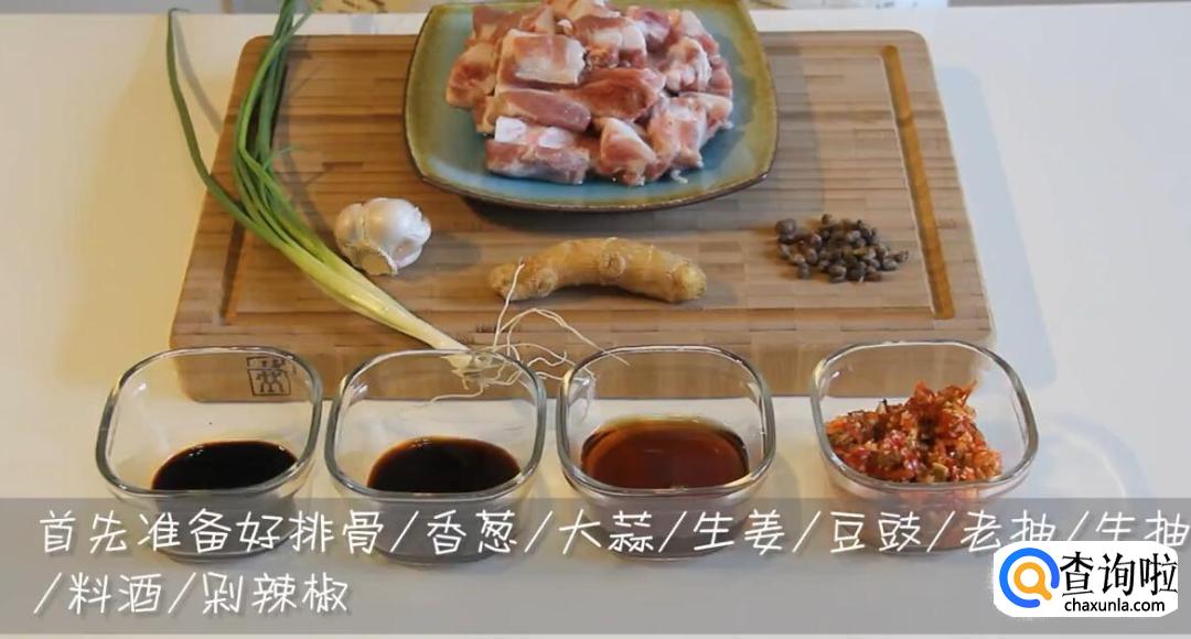 排骨500克、豆豉5克、香葱5克、大蒜5克、生姜10克、老抽5克、生抽15克、料酒50克、剁辣椒80克