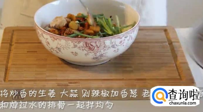 将炒香的生姜、大蒜、剁辣椒加香葱、老抽、生抽、料酒和焯过水的排骨一起拌匀。
