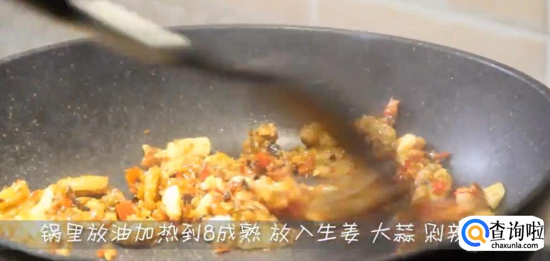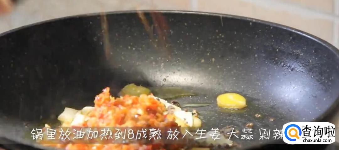 锅内放油加热到8成熟,放入生姜、大蒜、剁辣椒炒香。