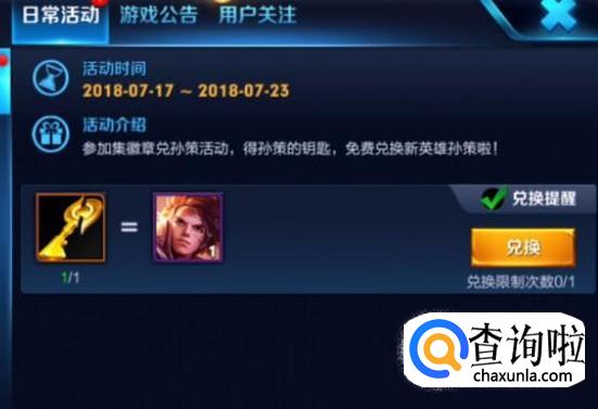 收集齐七张徽章之后,即可合成兑换钥匙,然后用钥匙去兑换孙策英雄,如图所示。