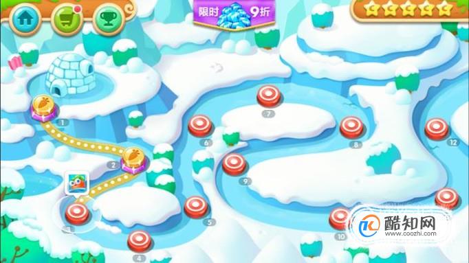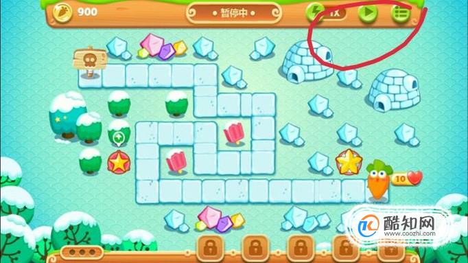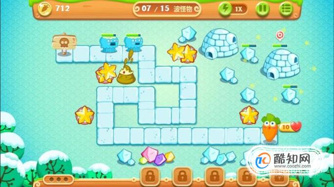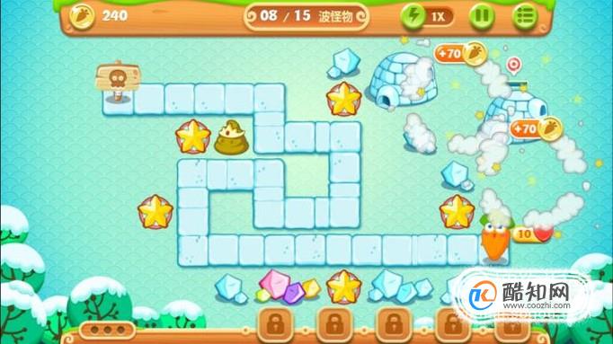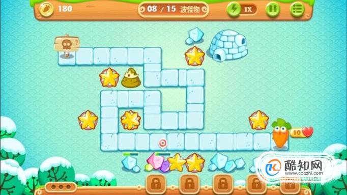 道具清除以后你就会获得金币,在靠近出口的地方安装一个炸弹星,接着将中间那个冰淇淋清除,在靠近出口的地方安装一个便便用来减速