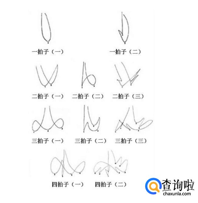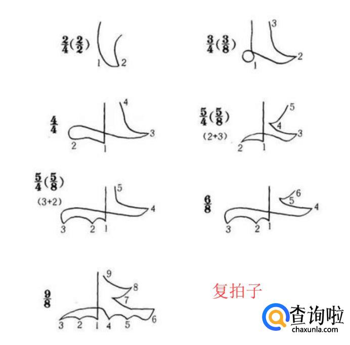 我们来看看节拍的基本方法:指挥的时候两手上不能超过肩,下不能低过腰。节拍的基本手势是:下左右上。如图可见几种拍子节奏。