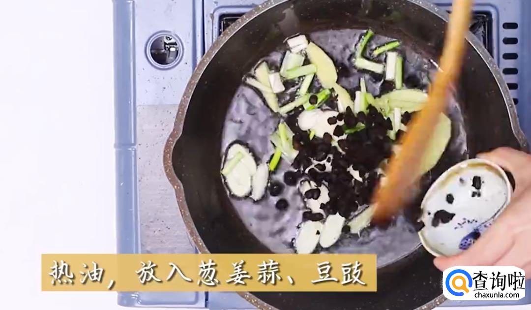 锅里热油后,放入葱姜蒜和豆豉炒出香味。