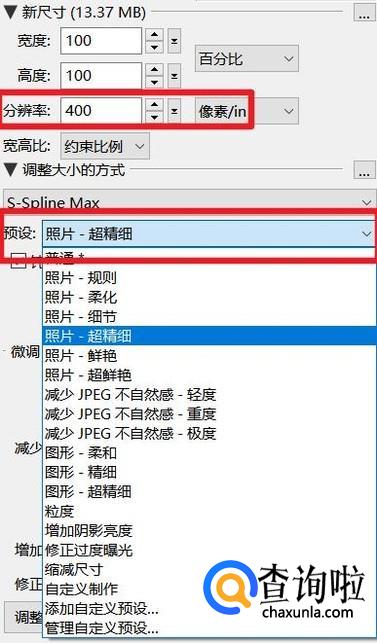 在左侧面板区域调整分辨率,在原有基础上增加(建议设定为元分辨率的倍数,如1倍/1.5倍/2倍等),然后在 预设 里选择 照片 - 超精细 ,模糊照片的清晰度会有所提高。