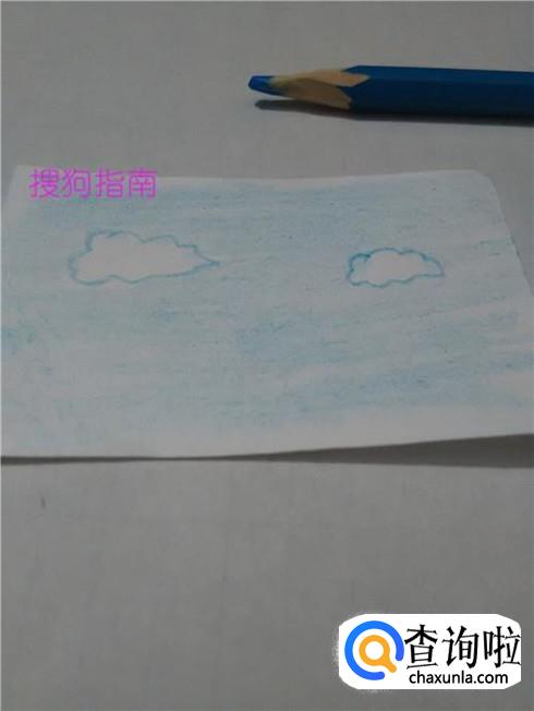用浅蓝色笔将云朵以外的地方均匀地涂上浅蓝色,表示蓝天,晴朗的天空就画完了。