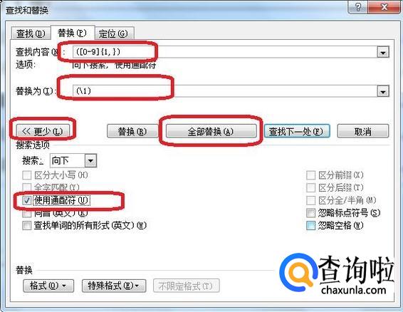 出现“查找和替换”选项框,如图所示,在查找内容栏输入([0-9]{1,}),在替换栏里输入(1),点击下面的“更多”按钮。出现扩展项,勾选其中的“使用通配符”,然后点击“全部替换”。