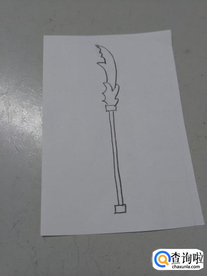 在长方形下面再画一个特别细长的长方形,表示青龙偃月刀的刀杆,在刀杆的下面再画一个小的长方形,表示青龙偃月刀的刀把,青龙偃月刀就画好了。