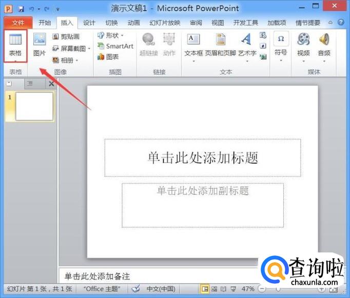 打开PPT之后我们找到插入选项里的表格选项,如图所示: