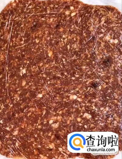 然后我们在桌子上铺一层吸油纸,放入搅拌好的肉馅,在上面铺一层保鲜膜,用擀面杖擀成一元硬币的厚度