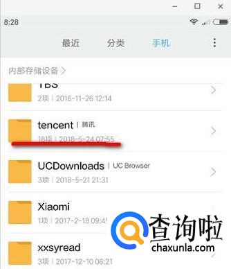 但,如果你所下载的文件不是最近的,那么,我们就要点开“手机”这一项,展开里面的内容。然后,找到“腾讯”这一项。