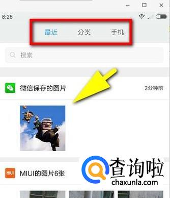 当前显示的是“最近”这一项内容。下图中箭头所指的图片是我刚才接收并下载的图片文件。因为是刚刚操作的,所以在这里显示。