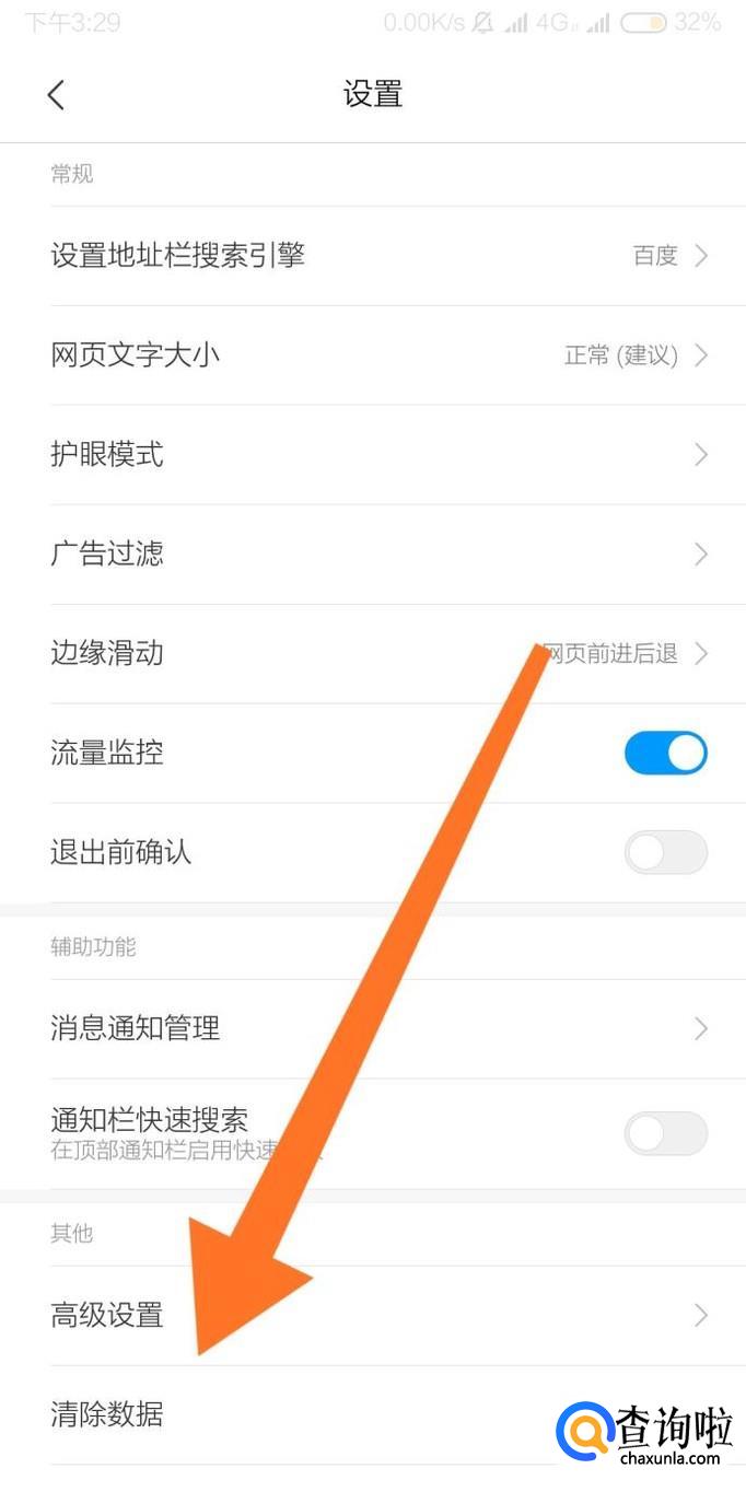 进入浏览器设置页面后,点击“清除数据”选项。
