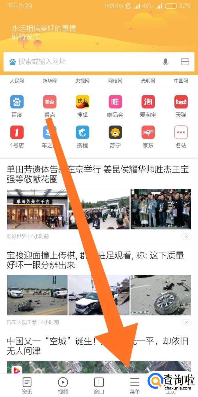 进入浏览器后,点击底部“菜单”字样。