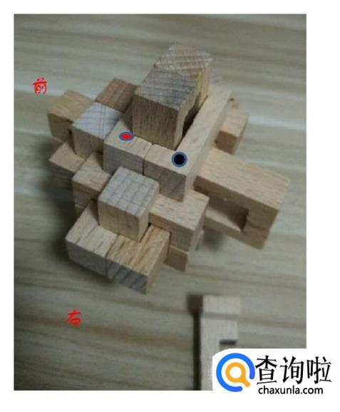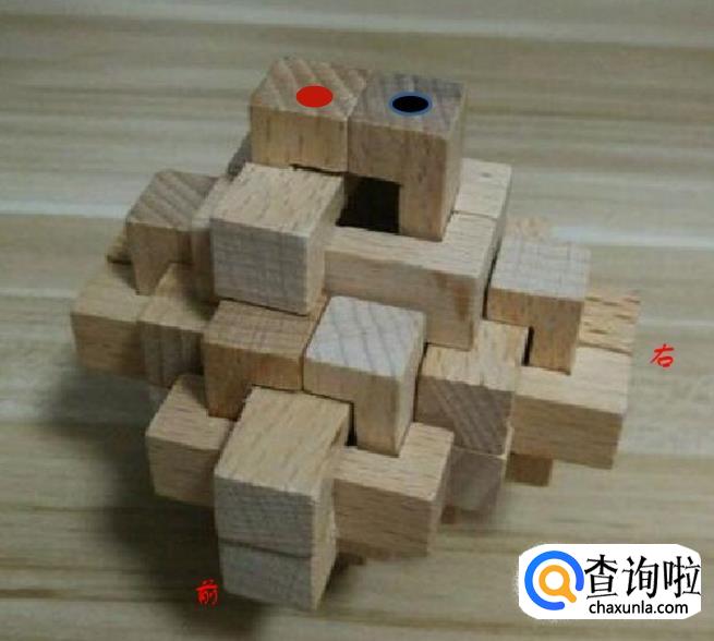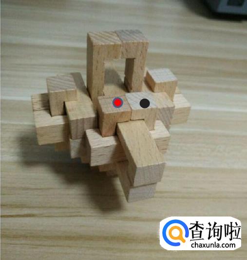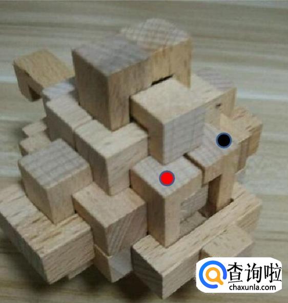 这样我们就取出了三个木条。接着我们把顶部标记红色和黑色的小木条取出。