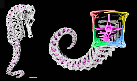 首先,对海马尾部的弯曲能力及骨板结构进行观察。构成海马尾巴的骨板越靠近尾侧越小,使海马可以把它的尾巴平滑地弯曲成一个对数螺线,在近尾尖处达到最大的曲率。经过测量,发现海马的尾巴末端能向腹侧弯曲多达850°,而向背侧及两侧的弯曲程度也分别可达290°和570°。海马每片骨板的大小、倾斜角度及彼此交叠程度都能影响它弯曲的能力。
