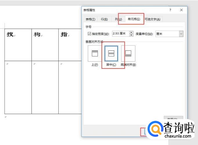 接下来,在打开的表格属性页面中,点击切换至“单元格”选项卡,并点击选择“居中对齐”模式,点击“确定”按钮。