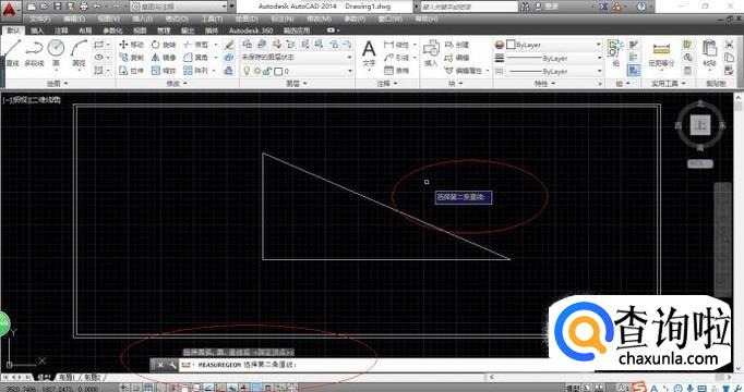 如图所示,命令窗口显示"MEASUREGEOM 选择第二条直线"。拾取夹角的第二条直线,鼠标左键确认。