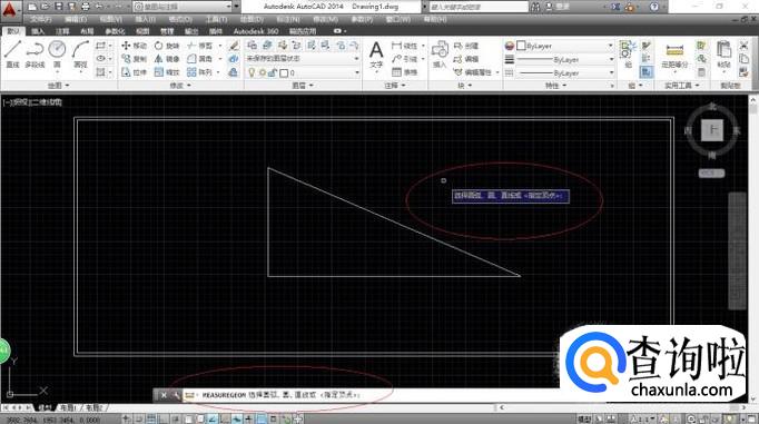 命令窗口显示"MEASUREGEOM 选择圆弧、圆、直线或<指定顶点>",如图所示。拾取夹角的第一条直线,鼠标左键确认。