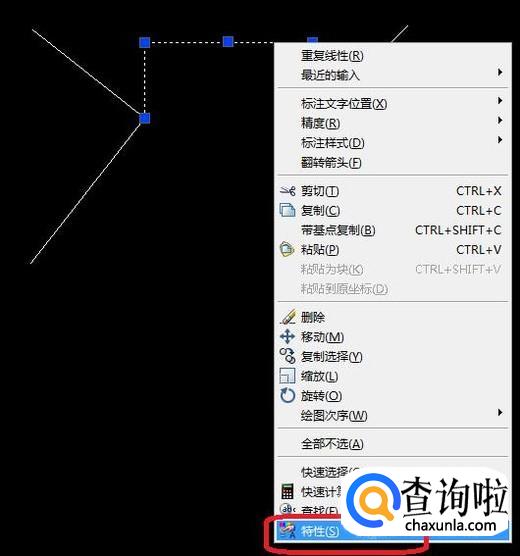 鼠标点击选中整个线性标注,然后右键单击,选择“特性”。