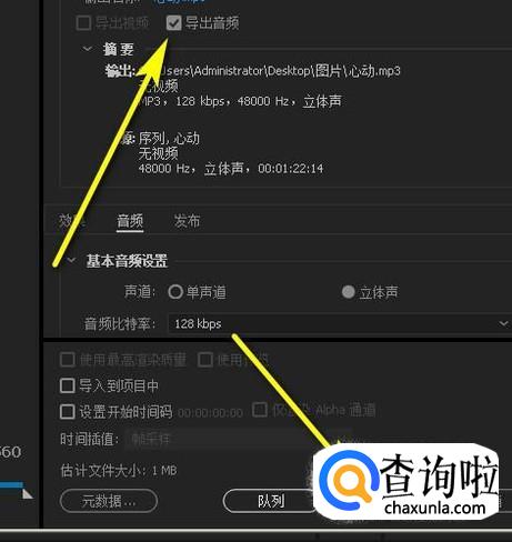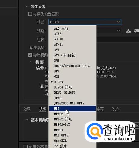 按下CTRL+M,调出导出设置面板。在导出设置的格式这里,设置为MP3