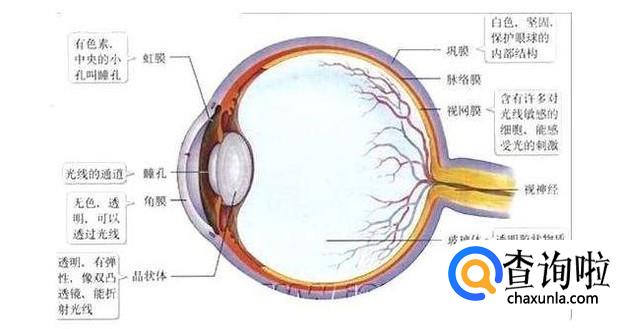 人们的眼睛是近似球形的,可以感知外界外形颜色的器官。是通过最外层的角膜内层的瞳孔和晶状体,四周包围这虹膜,再往里走是玻璃体,最后面依次是视网膜、脉络膜和巩膜,其中还有神经血管等组织。