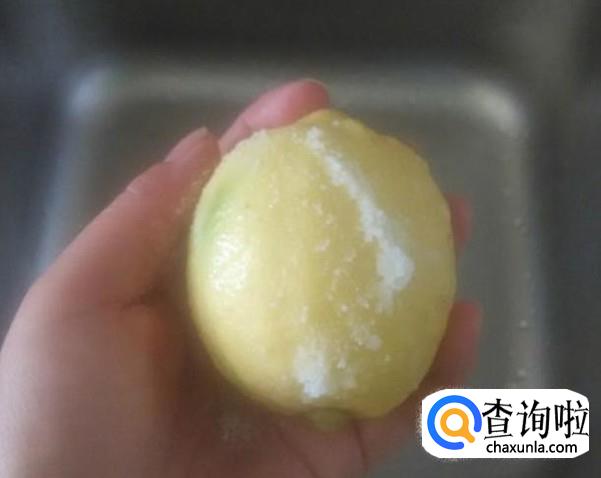 然后就能拿出家里刚刚买好的柠檬,并且用盐水擦拭在柠檬的各个地方,接下来就能用清水冲洗干净。