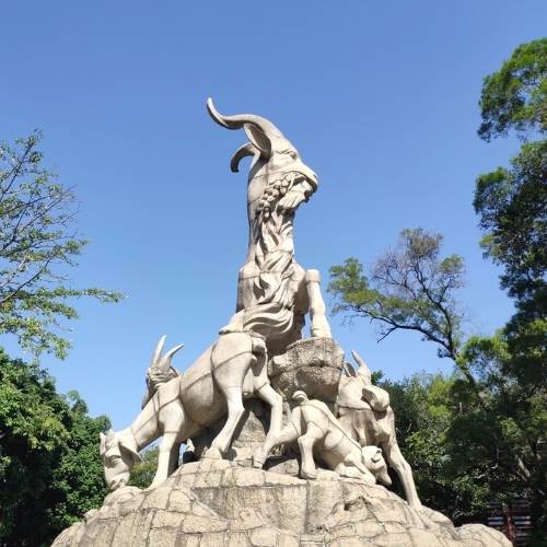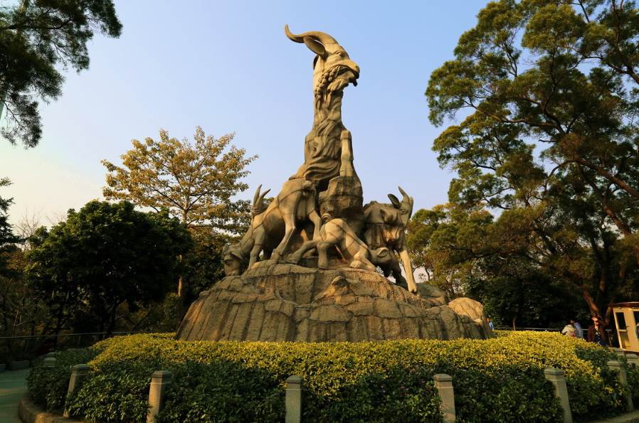 在很久以前,广州地区的百姓还过着比较原始的生活,经常吃不饱肚子。突然有一天,从天上出现了五位神仙,神仙骑着仙羊,仙羊嘴里衔着丰满的稻谷,降临这里。仙人把稻谷种子送给广州先民,教会他们种植粮食的技术。之后仙人腾空飞逝,五只仙羊化为石羊留在了这里。从此,广州便成为岭南最富庶的地方。