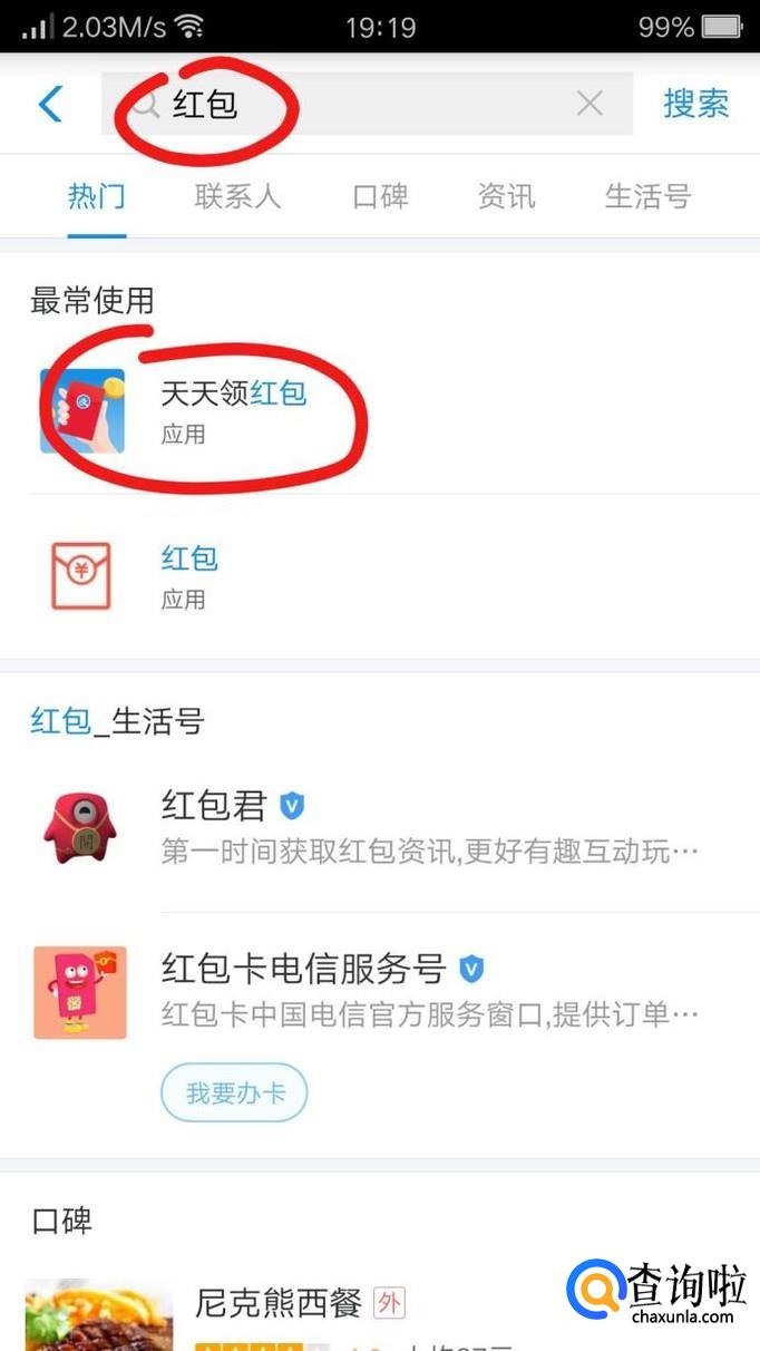 输入“红包”,下面会出现“天天领红包”,点进去。