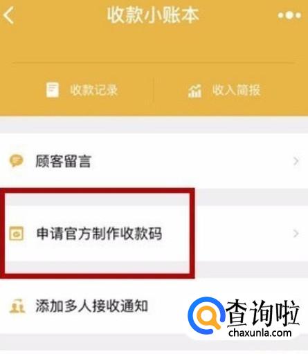 进入“收款小账本”页面后,我们点击“申请官方制作收款码”按钮,开始进行操作。