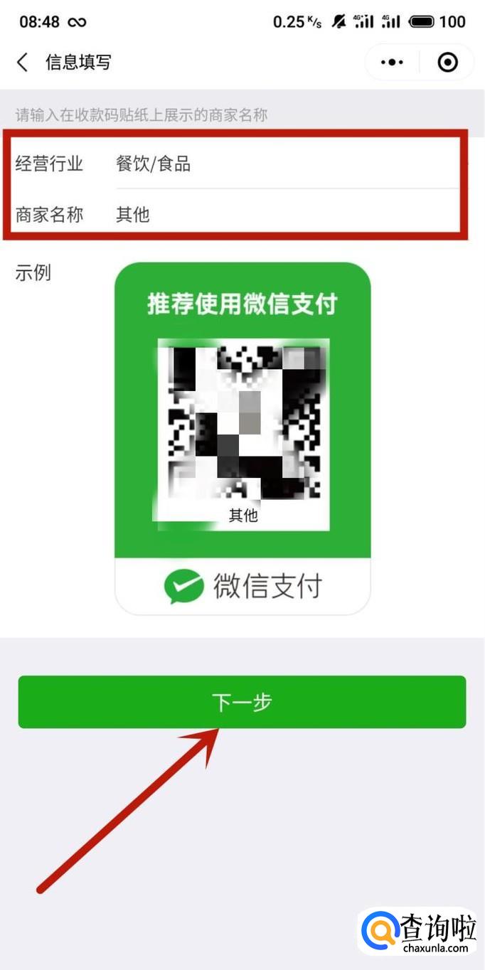 进入下一页面填写“经营行业”和“商家名称”,点击“下一步”,如图所示。