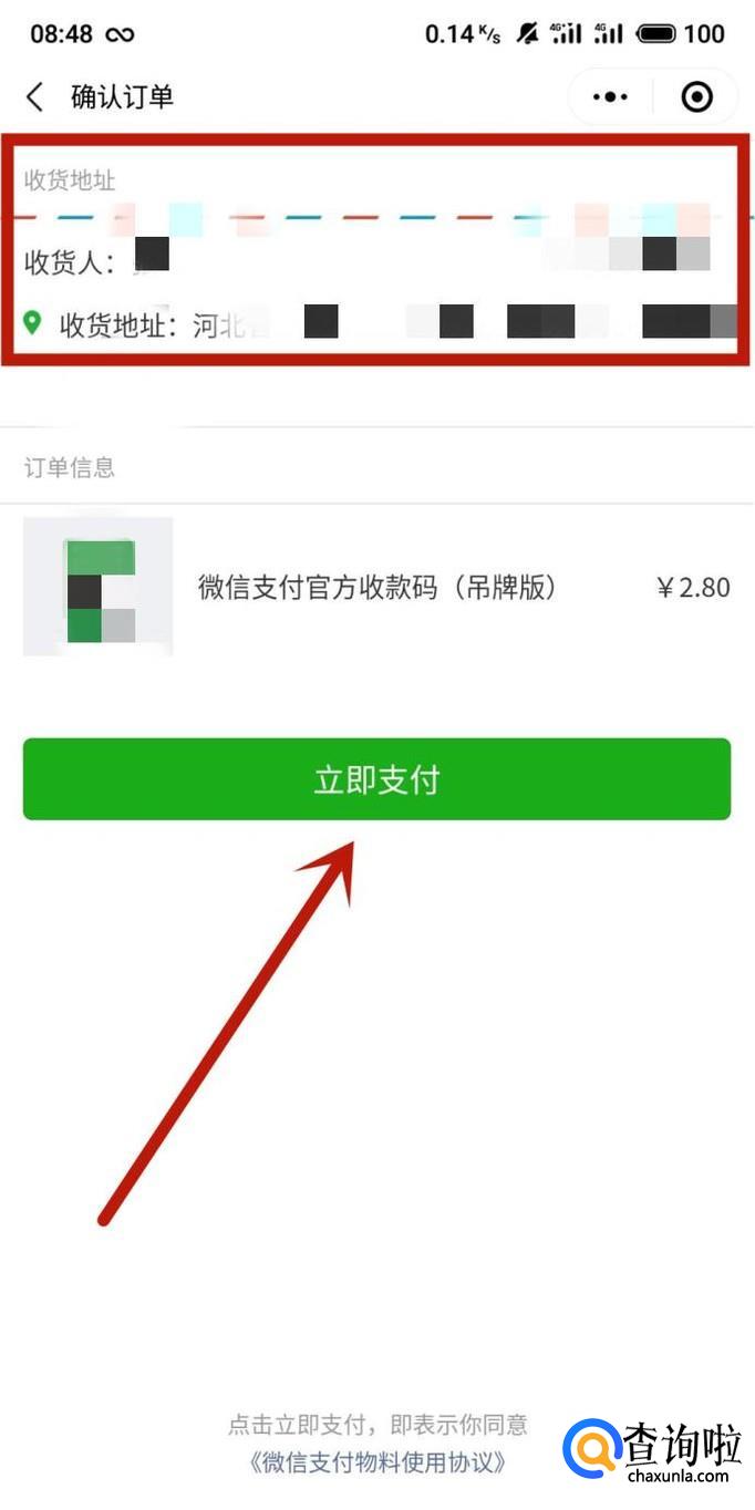 进入之后,填写收货地址,点击“立即支付”。