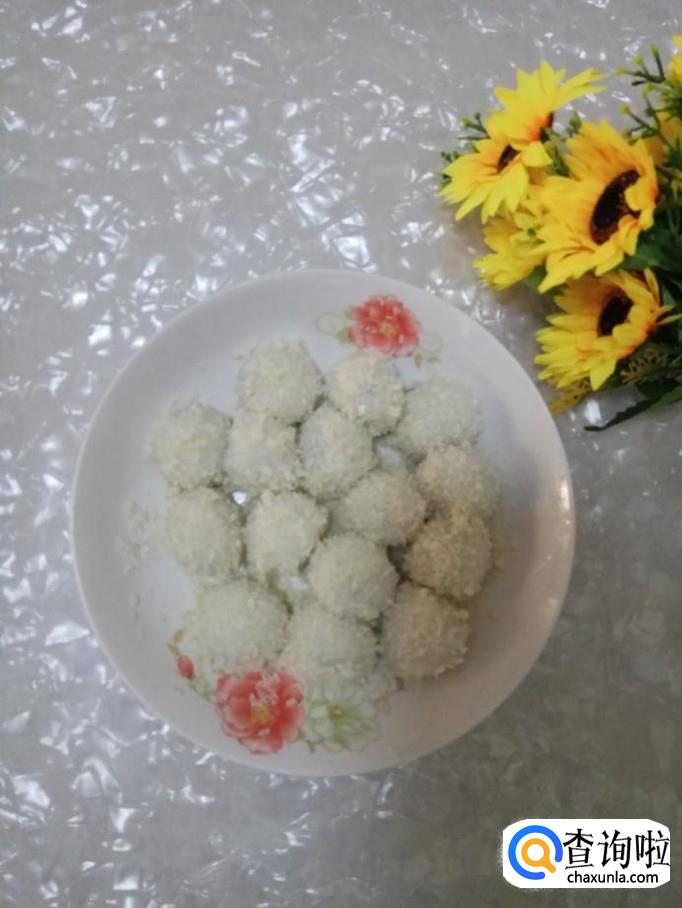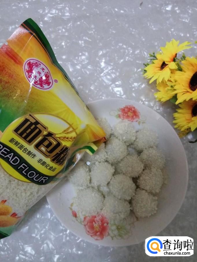 取适量面包糠倒在上面,让每颗汤圆都均匀的沾上一层面包糠。