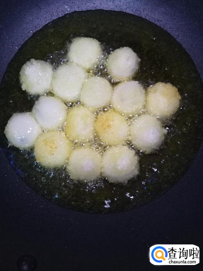 油锅中放入适量油,大约在油温五成热的时候,放入裹好面包糠的汤圆儿,小火慢炸。注意,油温一定不能太高,不然的话,芝麻馅容易流出。