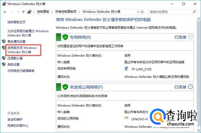 弹出的界面,我们点击启用或关闭Windows Defender防火墙;