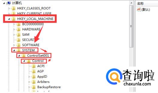 再然后逐次点击打开文件HKEY_LOCAL_MACHINE, SYSTEM, ControlSet001, Control。