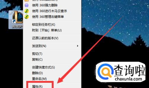 如果是兼容性的问题首先右键点击电脑桌面的英雄联盟的图标,点击“属性”。