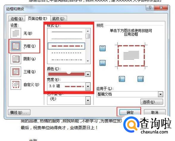 在弹出的边框与底纹对话框,在这里面的页面边框选项卡下面选择“方框“选项,在样式列表中选择你所需要的样式。