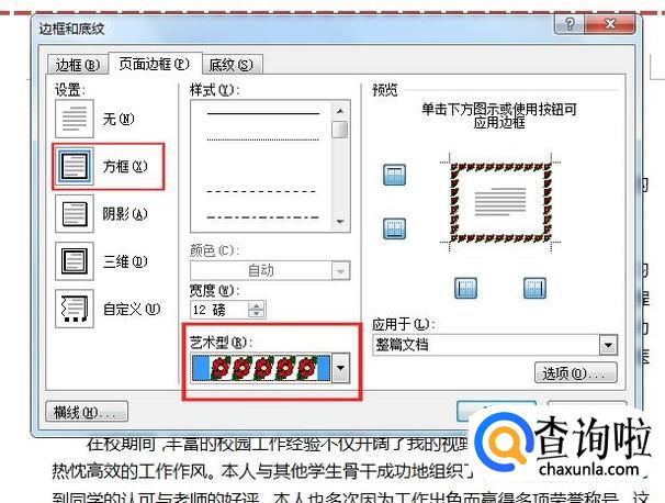 在打开的“边框与底纹“对话框中,在页面边框选项卡选择“方框“选项,下面可以选择”艺术型“右边的小的下三角按钮,然后会展开下拉列表,从中选择一种你喜欢的艺术表框。