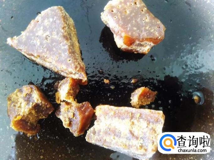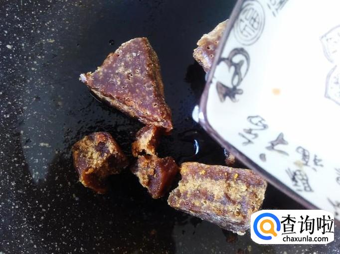 再开火,把土红糖搞成小块放进去,加点水花。