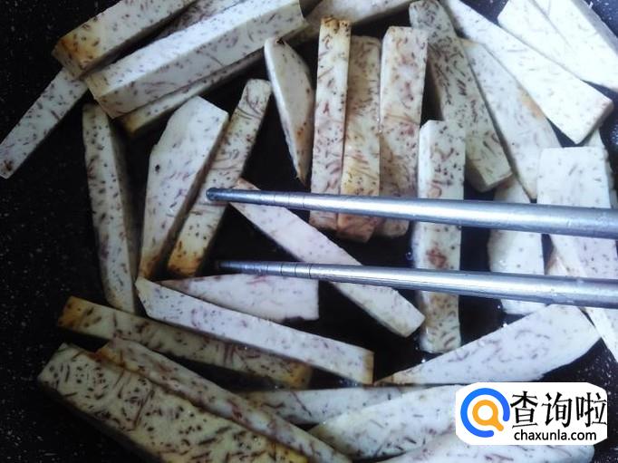 炸1分钟左右,然后用筷子把香芋不停地翻转,炸至香芋焦黄色,大约5分钟左右。