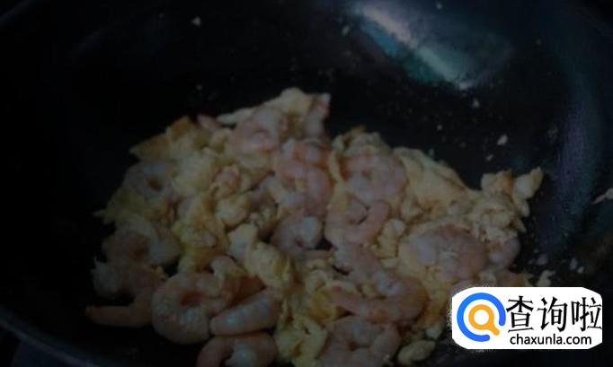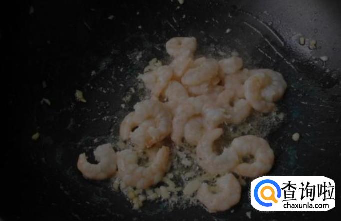 锅中加油,油8分热时加虾仁,爆炒,1分钟后加姜蒜末,炒匀