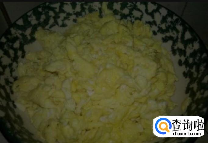 鸡蛋在锅中煎熟,搅碎, 加一点盐,搅匀,然后舀起